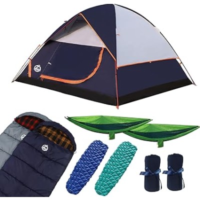 9-Piece Camping Tent Kit - 1 Dome Tent (2 or 3 Person), 2 Sleeping Bags, 2 Air Mattresses, 2 Single Camping Hammocks, 2 Blankets