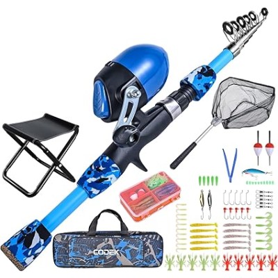 Kids Fishing Pole Set Portable Telescopic Kids Fishing Rods with Collasible Chair Fishing Net Carrier Bag and Full Kits for Boys