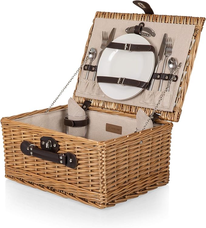Classic Picnic Basket for 2, Romantic Picnic for 2, Wicker Picnic Set, (Beige Canvas)