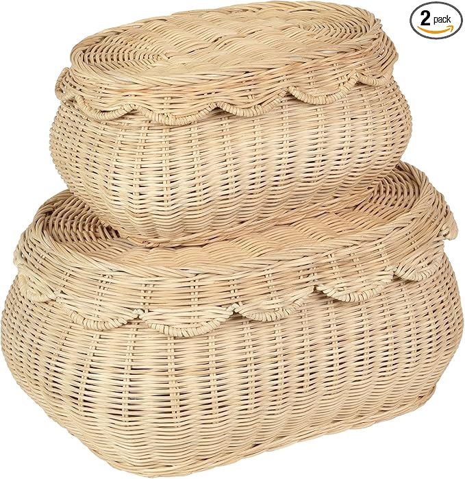 2Pcs Scalloped Baskets, Hand Woven Rattan Baskets with Lid, Small Scalloped Baskets, Wicker Storage Baskets, Basket For Decor,