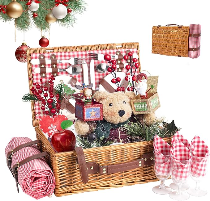 Wicker Picnic Basket Set for 4 with Waterproof Picnic Blanket and Insulated Cooler, Willow Hamper for Camping, Outdoor,
