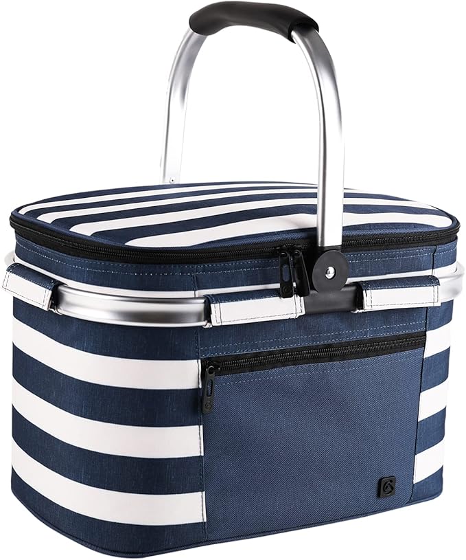 ALLCAMP Insulated Picnic Baskets Shoping Basket Cooler Bag Collapsible Portable Picnic Basket (Blue White Stripe)