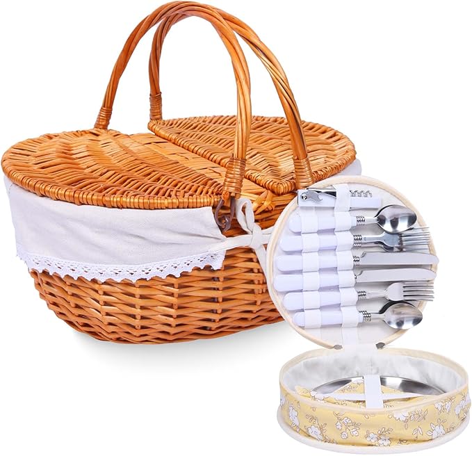 Wicker Picnic Basket Set for 4 with Lid and Handle Picnic Hamper with Washable Lining and Cutlery Set for Outdoor, Camping,