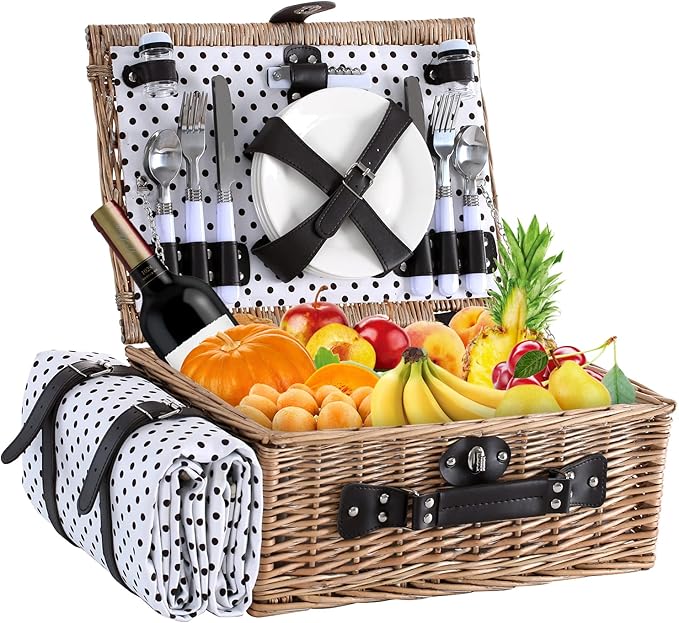 Picnic Basket for 4 Persons with Waterproof Picnic Blanket and Insulated Cooler, Large Wicker Picnic Basket for Camping,