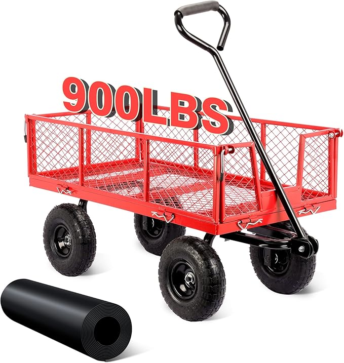 900Lbs Capacity Garden Cart, Steel Garden Wagon Cart Heavy Duty with Removable Sides, Flexible Handle Utility Cart Wagon, Red